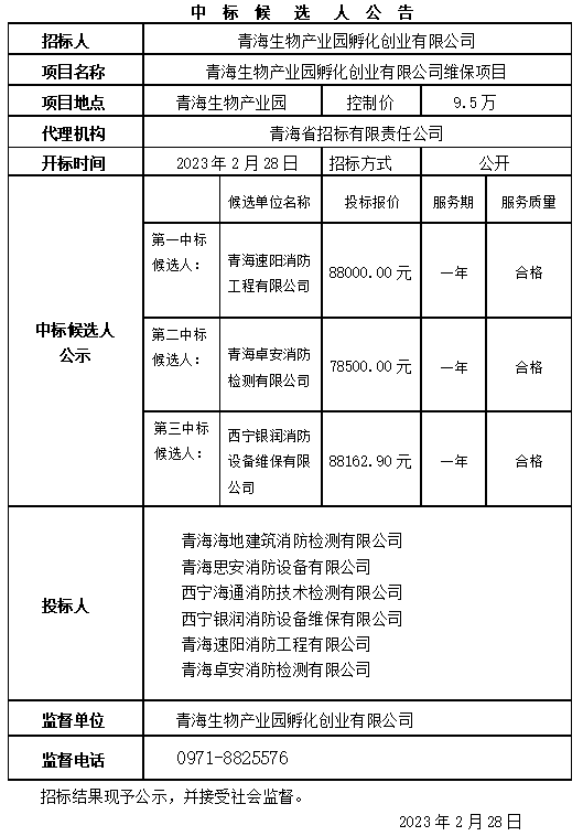 青海生物產(chǎn)業(yè)園孵化創(chuàng)業(yè)有限公司維保項目中標(biāo)候選人公示